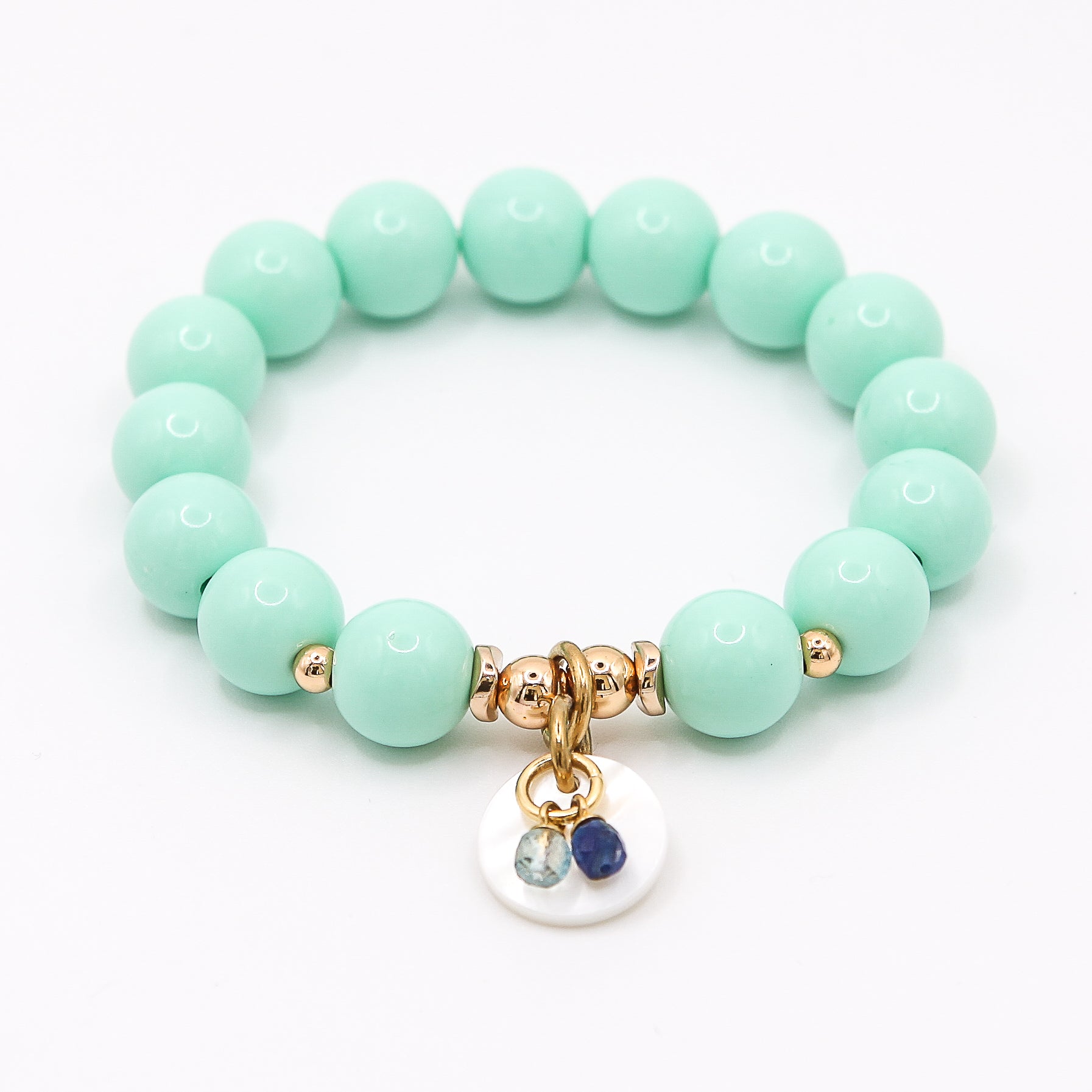 Beschreibung: Die hochwertigen Acrylperlen mit Hochglanzoptik sorgen für ein angenehm leichtes Tragegefühl. Mit einer Perlengröße von 12 mm und satten Farben sind sie ein echter Hingucker am Handgelenk. Der Acryllack macht dieses Armband herrlich unkompliziert und langlebig. Die goldenen Edelstahldetails und Charms verleihen dem Armband einen verspielten und zugleich edlen Look.