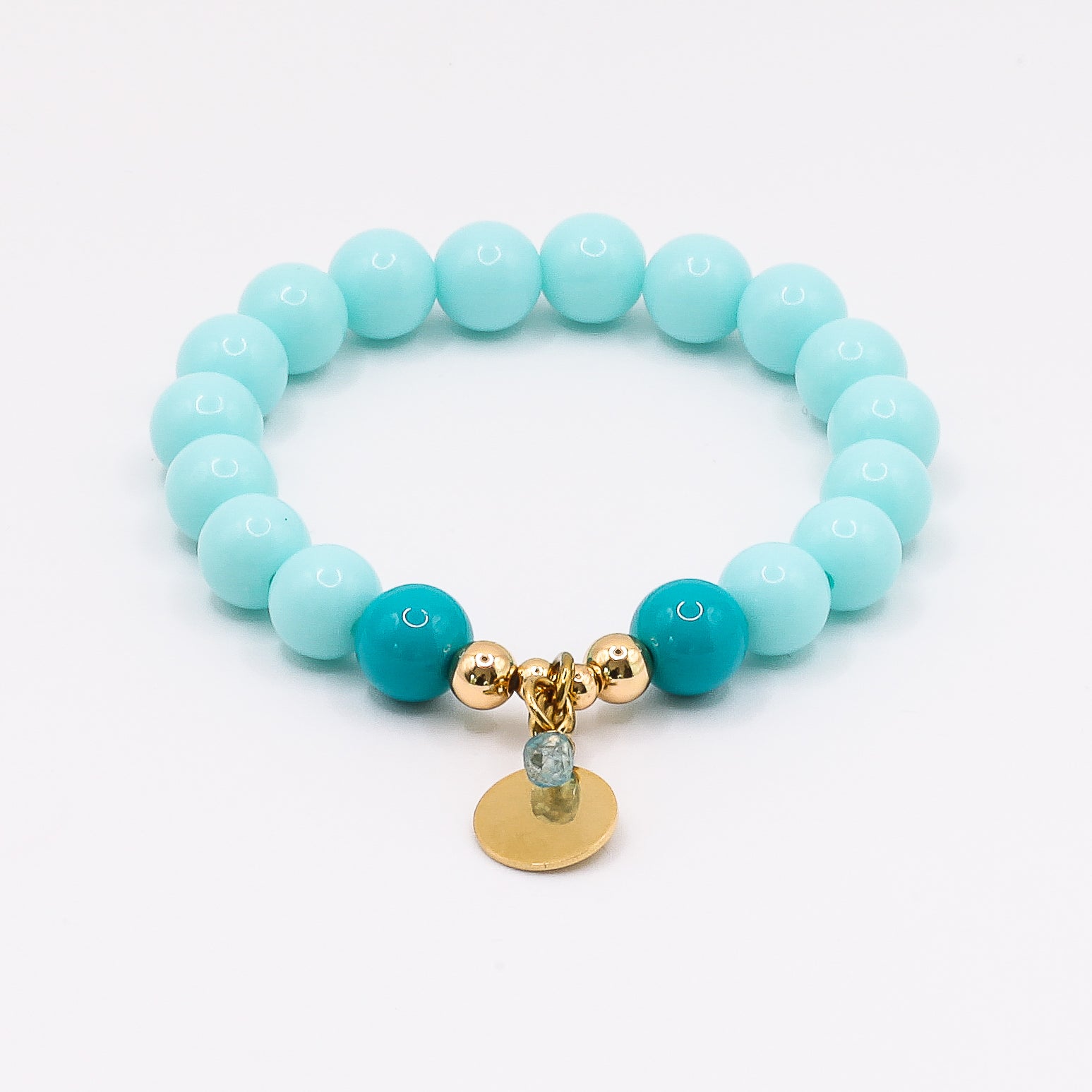 Beschreibung: Die hochwertigen Acrylperlen mit Hochglanzoptik sorgen für ein angenehm leichtes Tragegefühl. Mit einer Perlengröße von 10 mm sind sie unsere kleinsten Perlen. Dank der satten Farben dennoch ein echter Hingucker am Handgelenk! Sie lassen sich perfekt zu unseren größeren Perlenarmbänder kombinieren. Der Acryllack macht dieses Armband herrlich unkompliziert und langlebig. Die goldenen Edelstahldetails und Charms verleihen dem Armband einen verspielten und zugleich edlen Look.