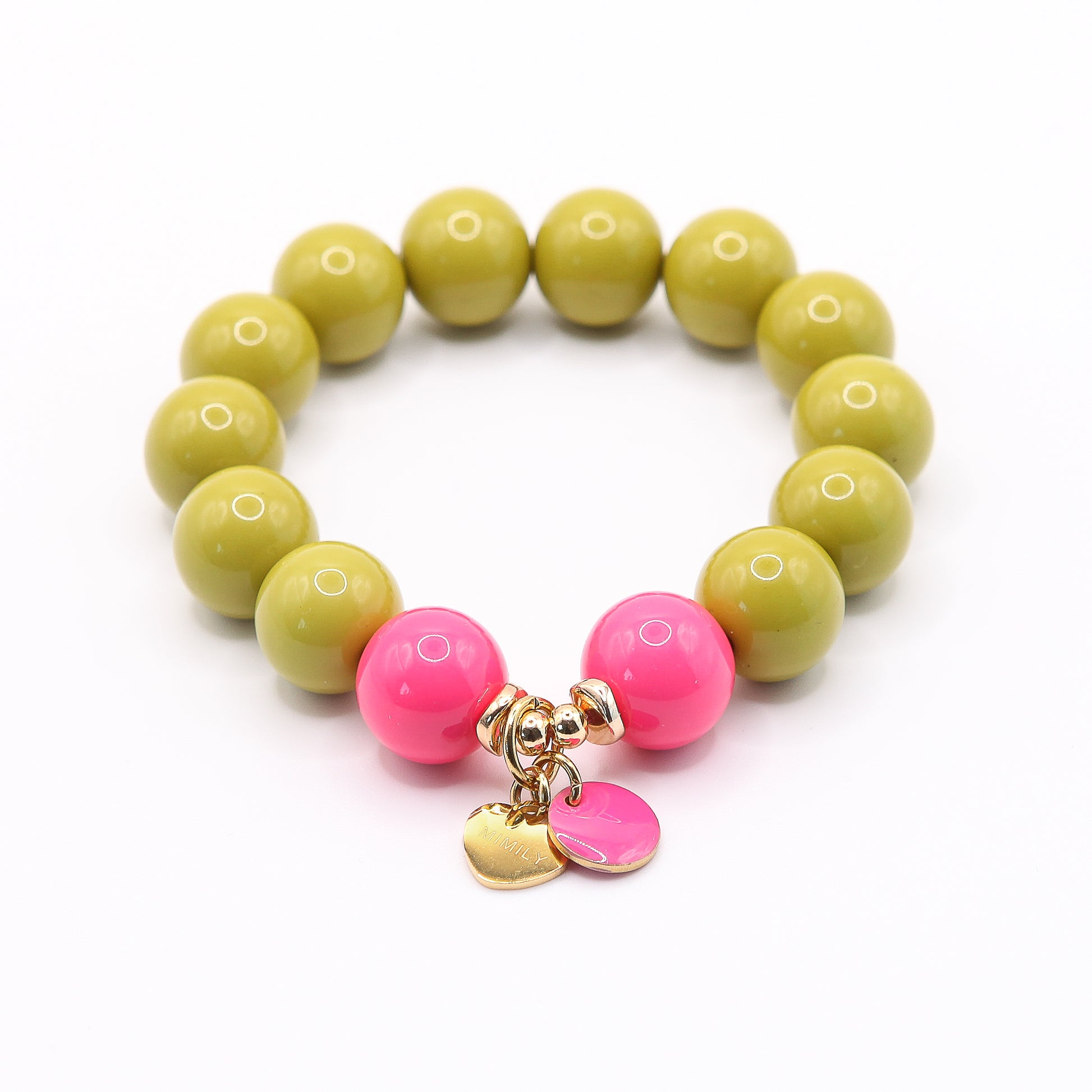 Beschreibung: Die hochwertigen Acrylperlen mit Hochglanzoptik sorgen für ein angenehm leichtes Tragegefühl. Mit einer Perlengröße von 14 mm und satten Farben sind sie ein echter Hingucker am Handgelenk. Der Acryllack macht dieses Armband herrlich unkompliziert und langlebig. Die goldenen Edelstahldetails und Charms verleihen dem Armband einen verspielten und zugleich edlen Look.