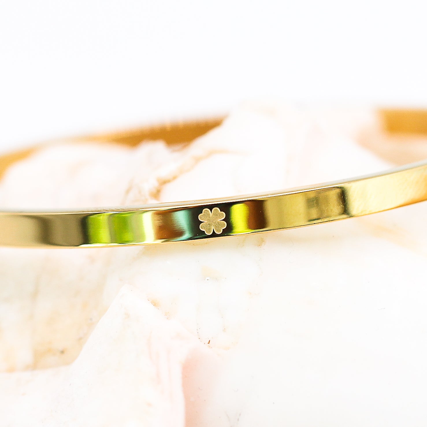 Beschreibung: Dieser wunderschöne Armreif aus hochwertigen 316L Edelstahl ist mit 18K Gold plattiert. Die qualitativ hochwertige Schließe versichert ein stabiles Tragen ohne ungewolltes Öffnen. Dieser Armreif ist der perfekte Glücksbringer - nicht aufdringlich, nicht unsichtbar - einfach nur schön.