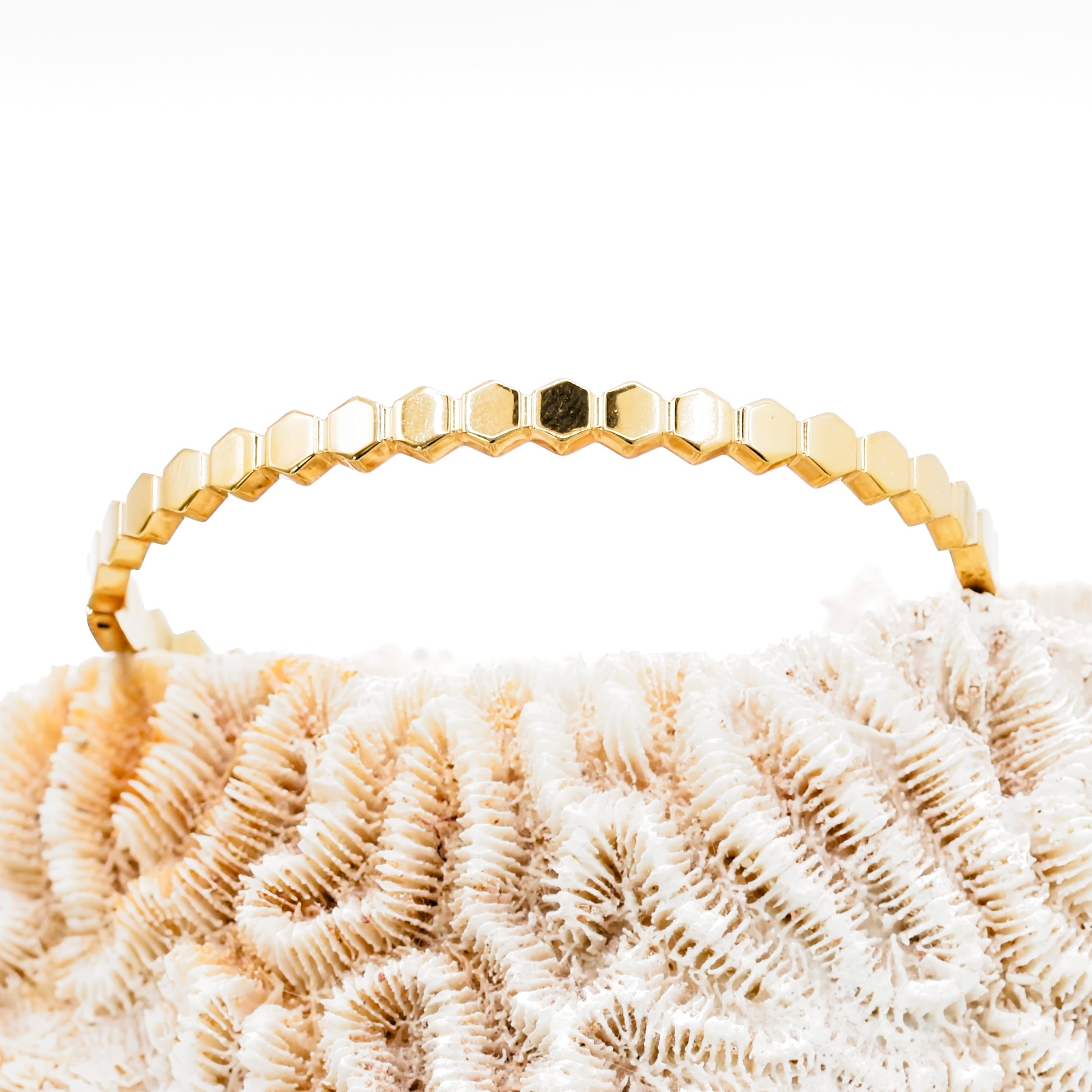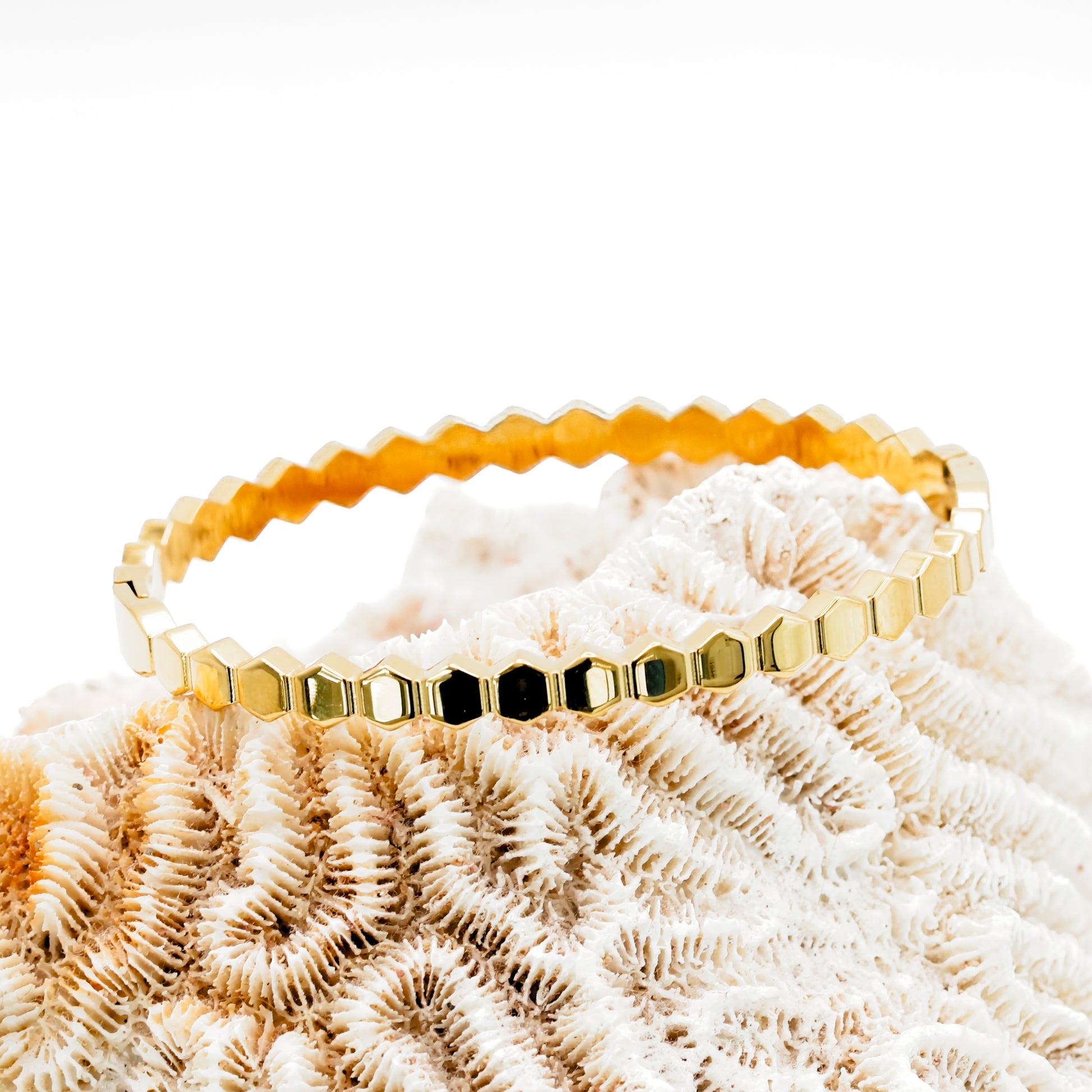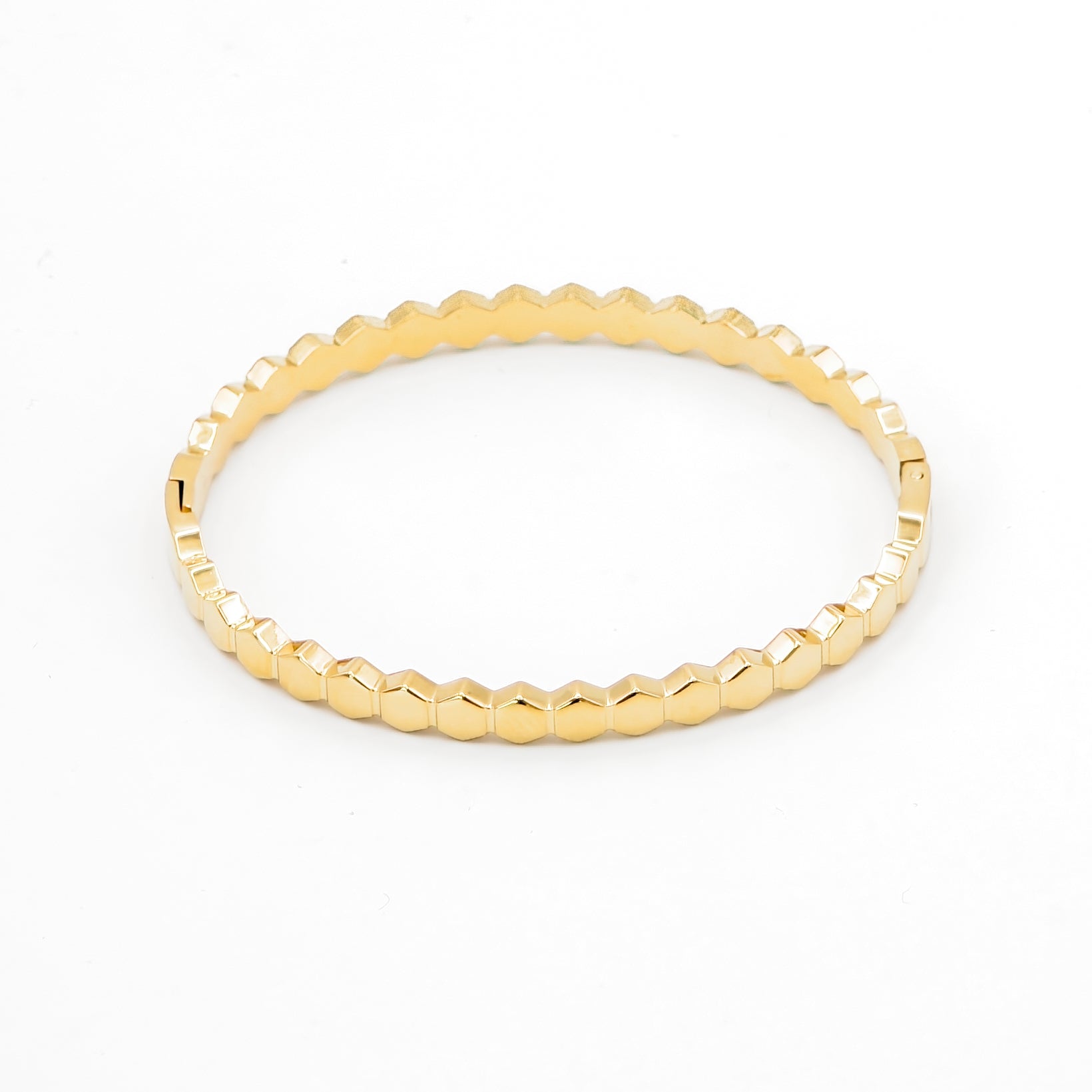 Beschreibung: Dieser wunderschöne Armreif mit Hexagon Design aus hochwertigen 316L Edelstahl ist mit 18K Gold plattiert. Die qualitativ hochwertige Schließe versichert ein stabiles Tragen ohne ungewolltes Öffnen. Dieser Armreif ist ein schlichter, dennoch interessanter Begleiter, der sich sehr gut mit anderen Schmuckstücken kombinieren lässt.