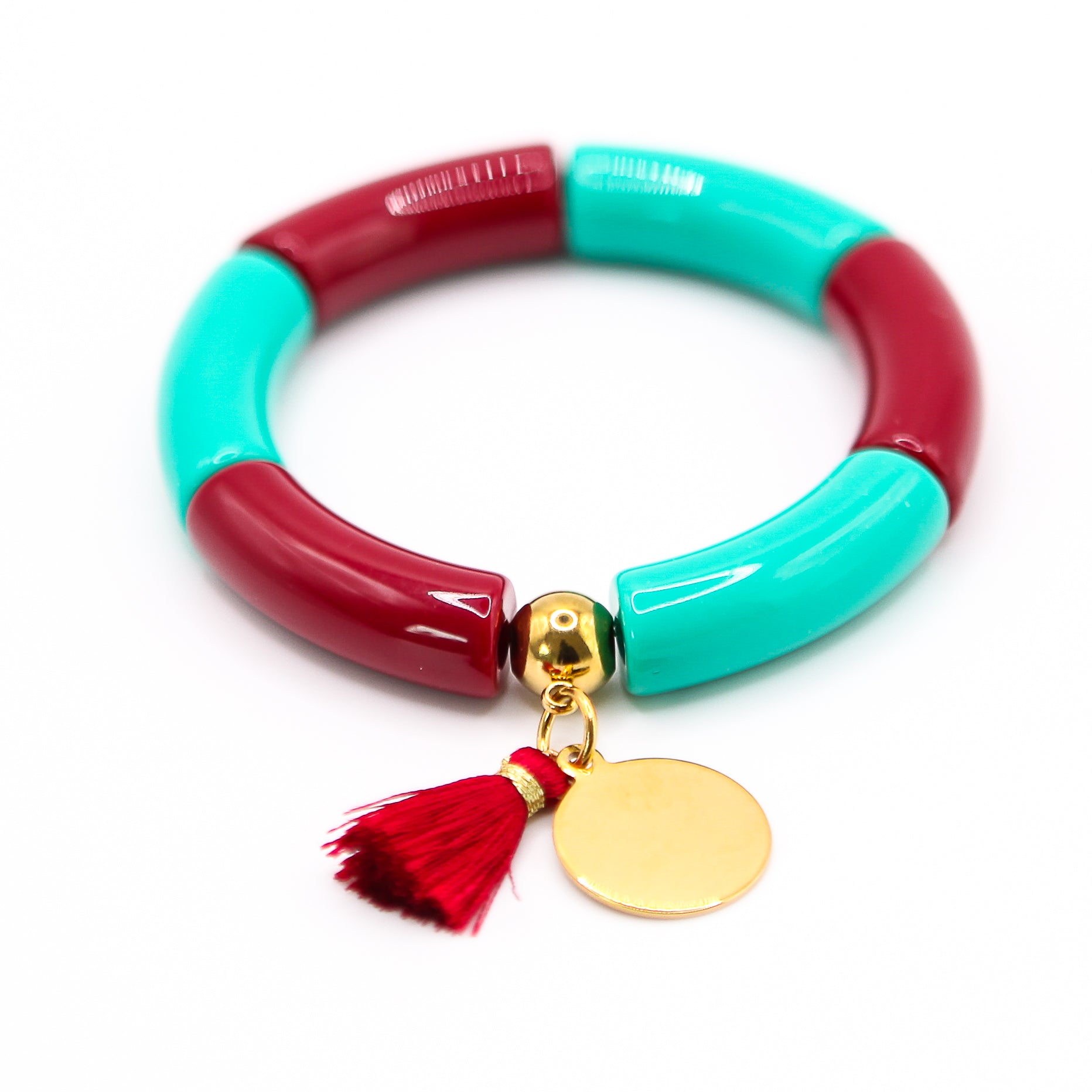 Beschreibung: Die hochwertigen Acrylelemente in Hochglanz sorgen für ein angenehm leichtes Tragegefühl und sind mit einem Durchmesser von 12 mm ein echter Hingucker am Handgelenk. Der Acryllack macht dieses Armband herrlich unkompliziert und langlebig. Die goldenen Edelstahldetails und Charms verleihen dem Armband einen verspielten und zugleich edlen Boho Look.