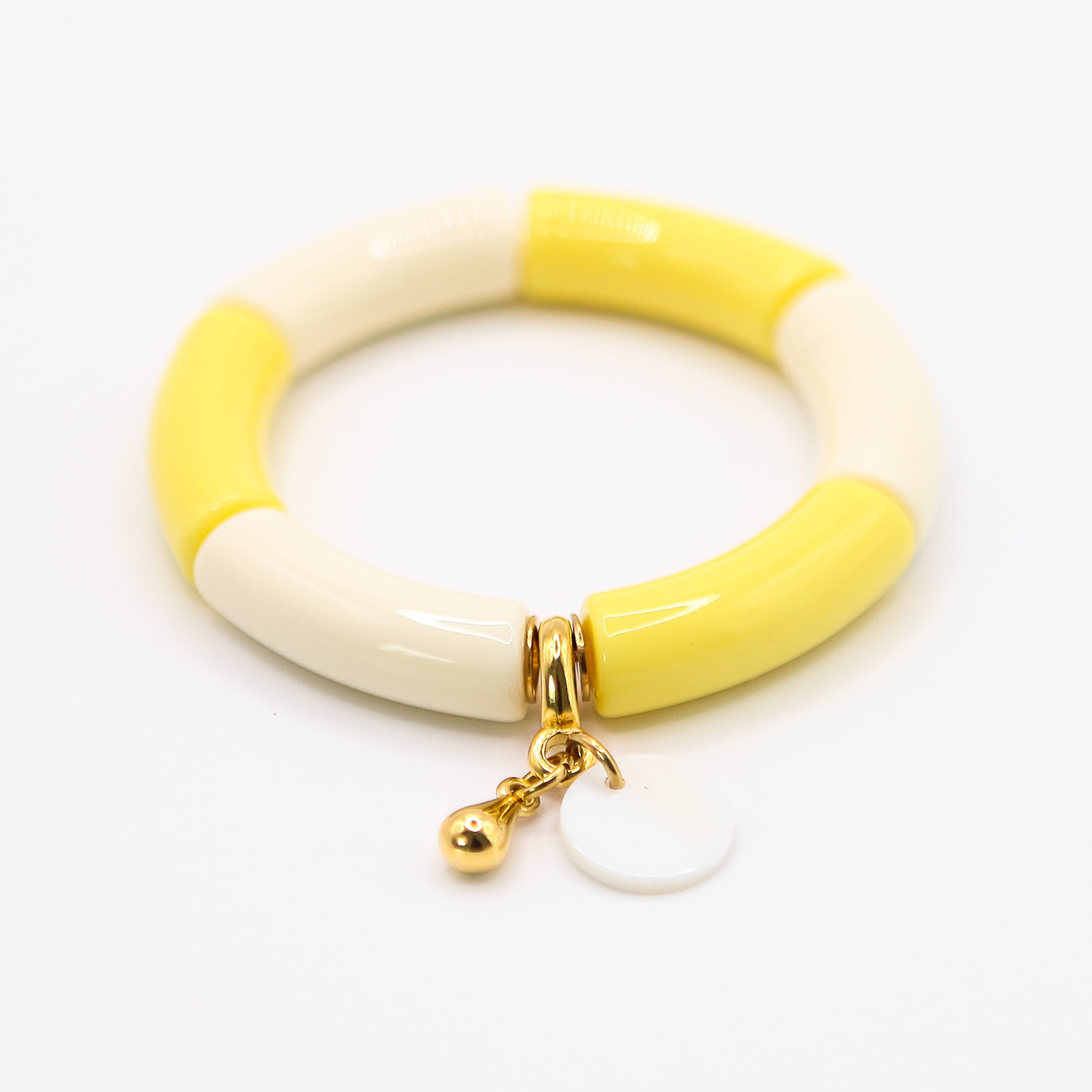 Beschreibung: Die hochwertigen Acrylelemente in Hochglanz sorgen für ein angenehm leichtes Tragegefühl und sind mit einem Durchmesser von 12 mm ein echter Hingucker am Handgelenk. Der Acryllack macht dieses Armband herrlich unkompliziert und langlebig. Die goldenen Edelstahldetails und Charms verleihen dem Armband einen verspielten und zugleich edlen Boho Look.