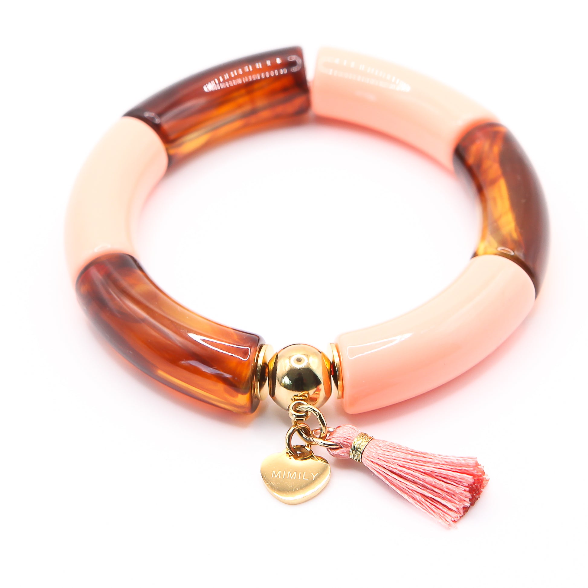 Beschreibung: Die hochwertigen Acrylelemente in Hochglanz sorgen für ein angenehm leichtes Tragegefühl und sind mit einem Durchmesser von 12 mm ein echter Hingucker am Handgelenk. Der Acryllack macht dieses Armband herrlich unkompliziert und langlebig. Die goldenen Edelstahldetails und Charms verleihen dem Armband einen verspielten und zugleich edlen Boho Look.