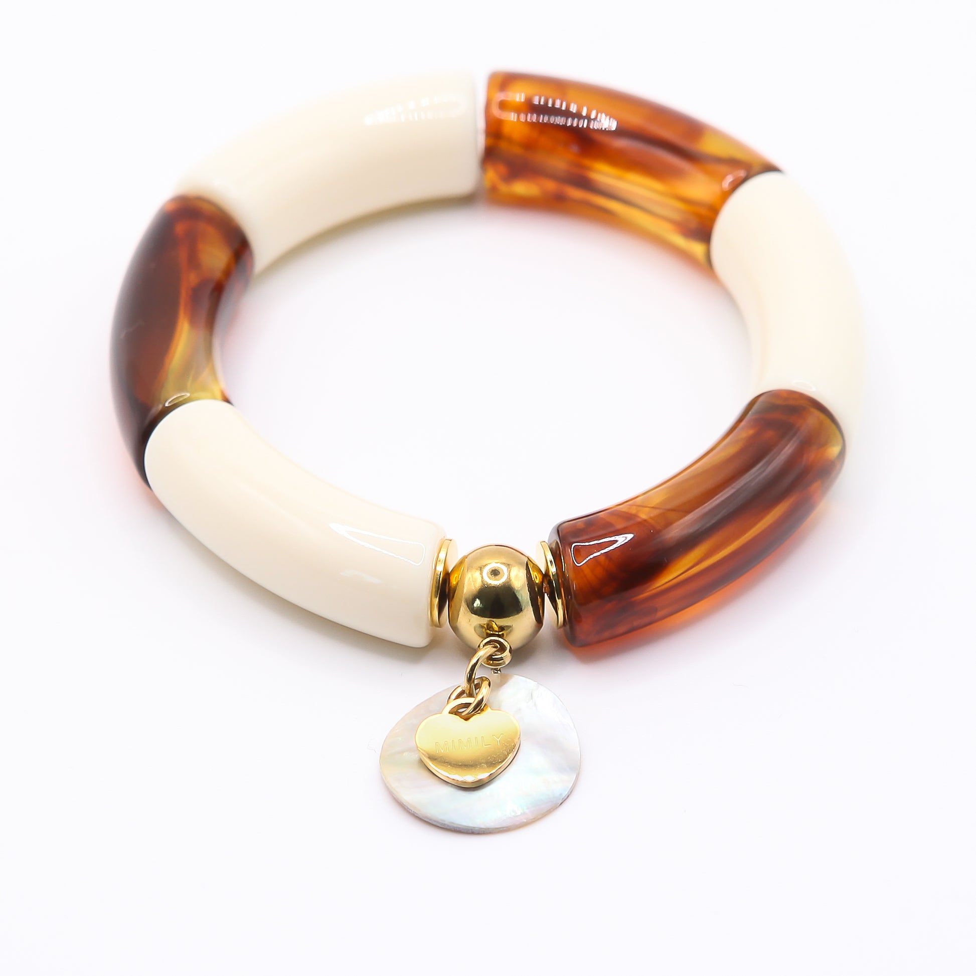 Beschreibung: Die hochwertigen Acrylelemente in Hochglanz sorgen für ein angenehm leichtes Tragegefühl und sind mit einem Durchmesser von 12 mm ein echter Hingucker am Handgelenk. Der Acryllack macht dieses Armband herrlich unkompliziert und langlebig. Die goldenen Edelstahldetails und Charms verleihen dem Armband einen verspielten und zugleich edlen Boho Look.