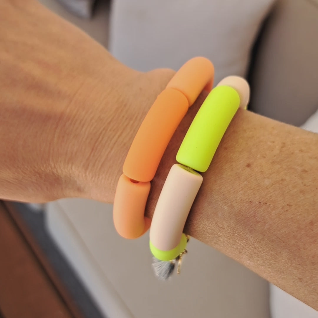 Beschreibung: Die hochwertigen Acrylelemente in Mattoptik sorgen für ein angenehm leichtes Tragegefühl und sind mit einem Durchmesser von 12 mm ein echter Hingucker am Handgelenk. Die Elemente in Mattoptik verfügen über eine samtige Oberfläche. Die goldenen Edelstahldetails und Charms verleihen dem Armband einen verspielten und zugleich edlen Boho Look.