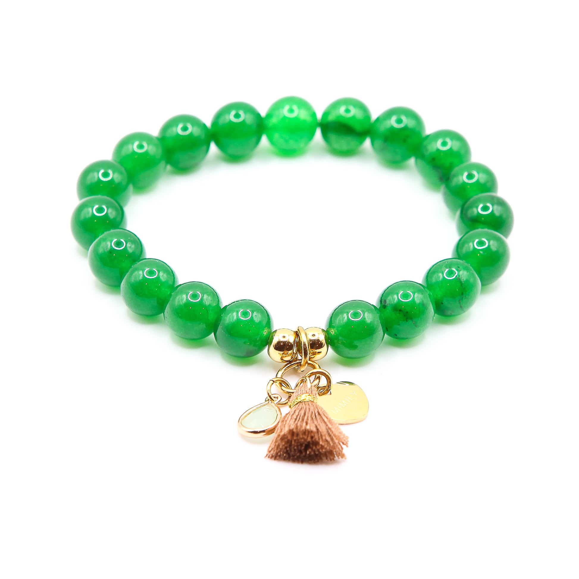 Material: Jade, Anhänger Herzchen: 18K Gold auf Edelstahl, kleiner Schmuckstein, Bommel, Elastikfaden