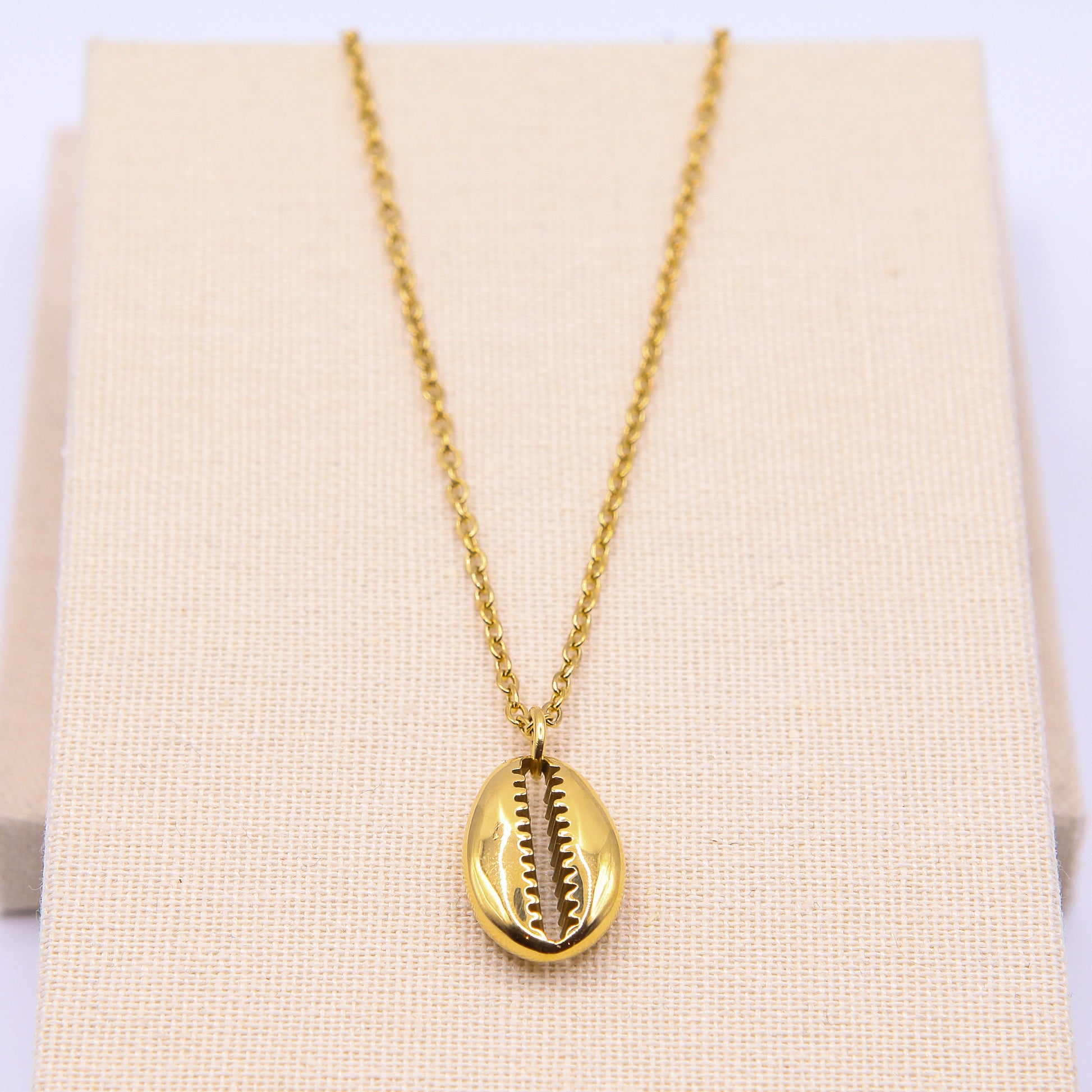 Beschreibung: Gliederkette mit einem massiven Kaffeebohnen Muschel Anhänger. Perfekt für alle Meeresliebhaber! Die goldene Muschel hat eine schöne Schwere und ist unglaublich angenehm zu tragen. Alle Materialen sind aus hochwertigen 316L Edelstahl mit 18K Gold plattiert.