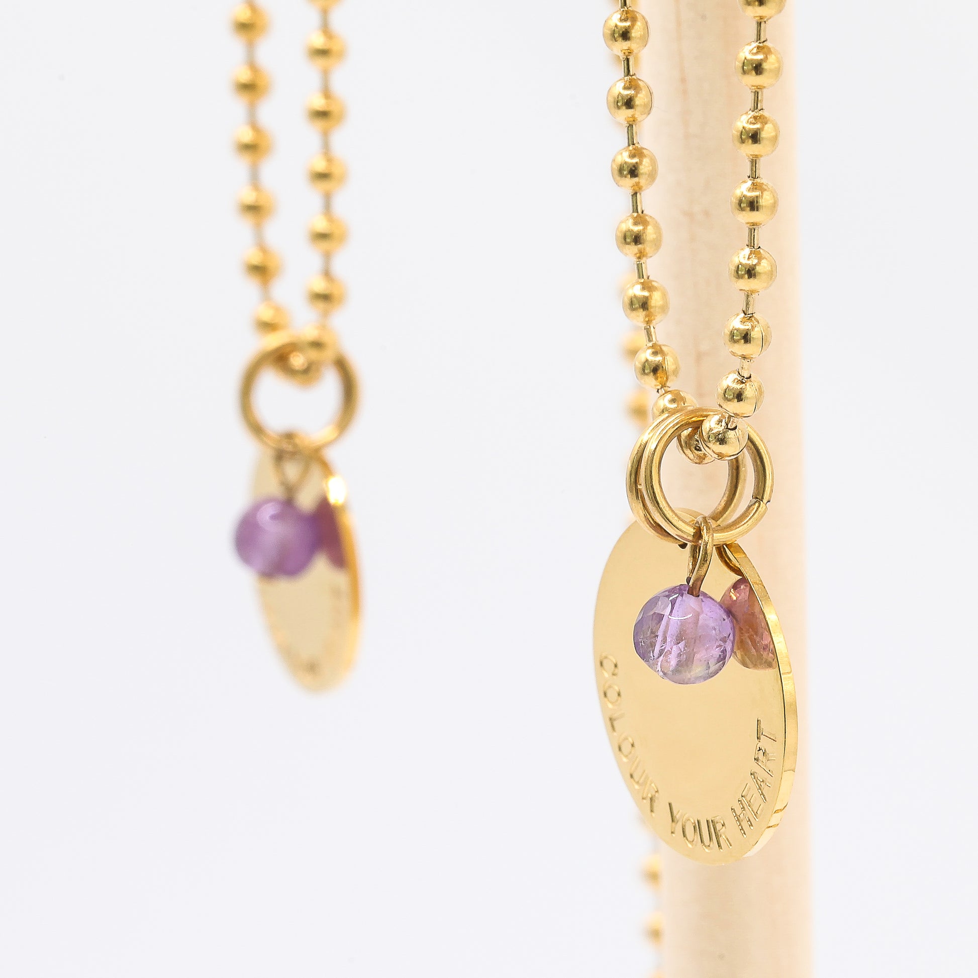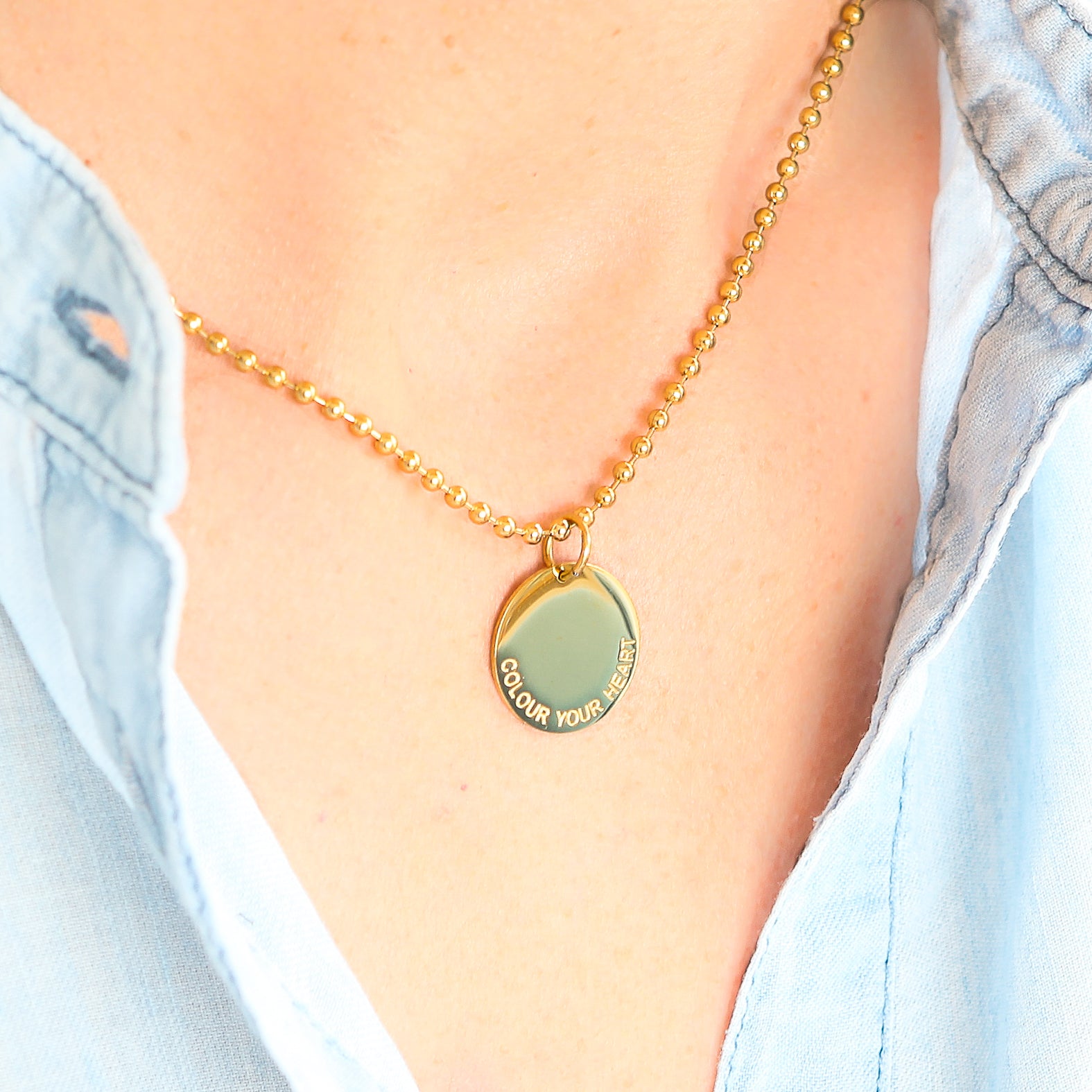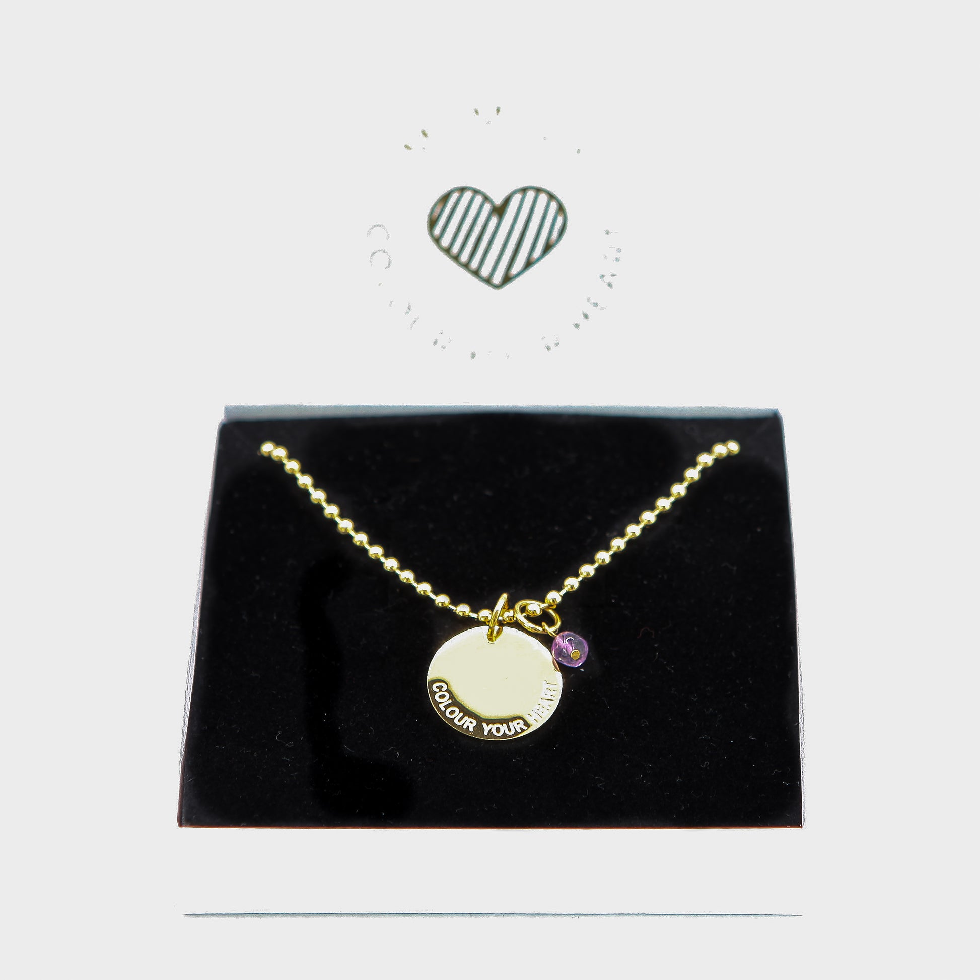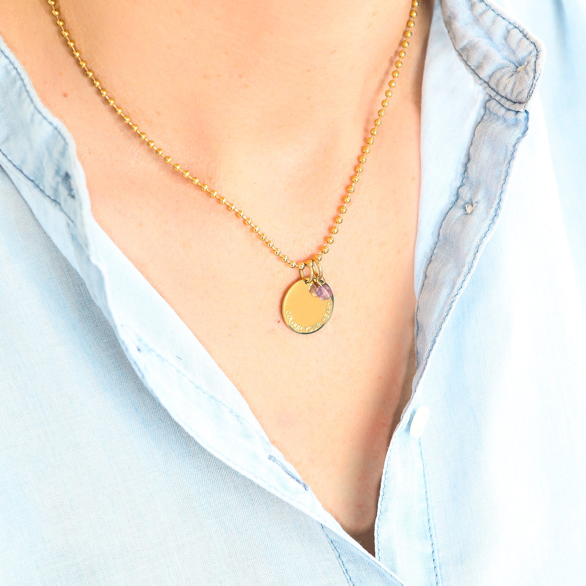 Beschreibung: Diese coole Gold Beads Halskette im Army Stil trägt eine 18 mm Durchmesser große Münze mit unserem Slogan: Colour Your Heart. Eine Message, die wir in der heutigen Zeit gar nicht genug beherzigen können. Mit jeder Kette gibt es einen kleinen Amethyst Halbedelstein gratis dazu. Wunderschön in Kombination oder nach Lust und Laune auch einzeln zu tragen. Alle Materialen sind aus hochwertigen 316L Edelstahl mit 18K Gold plattiert. Nicht nur schön für den Alltag, sondern auch ein wunderbarer Begleiter für Sonne, Strand, Pool und Meer.