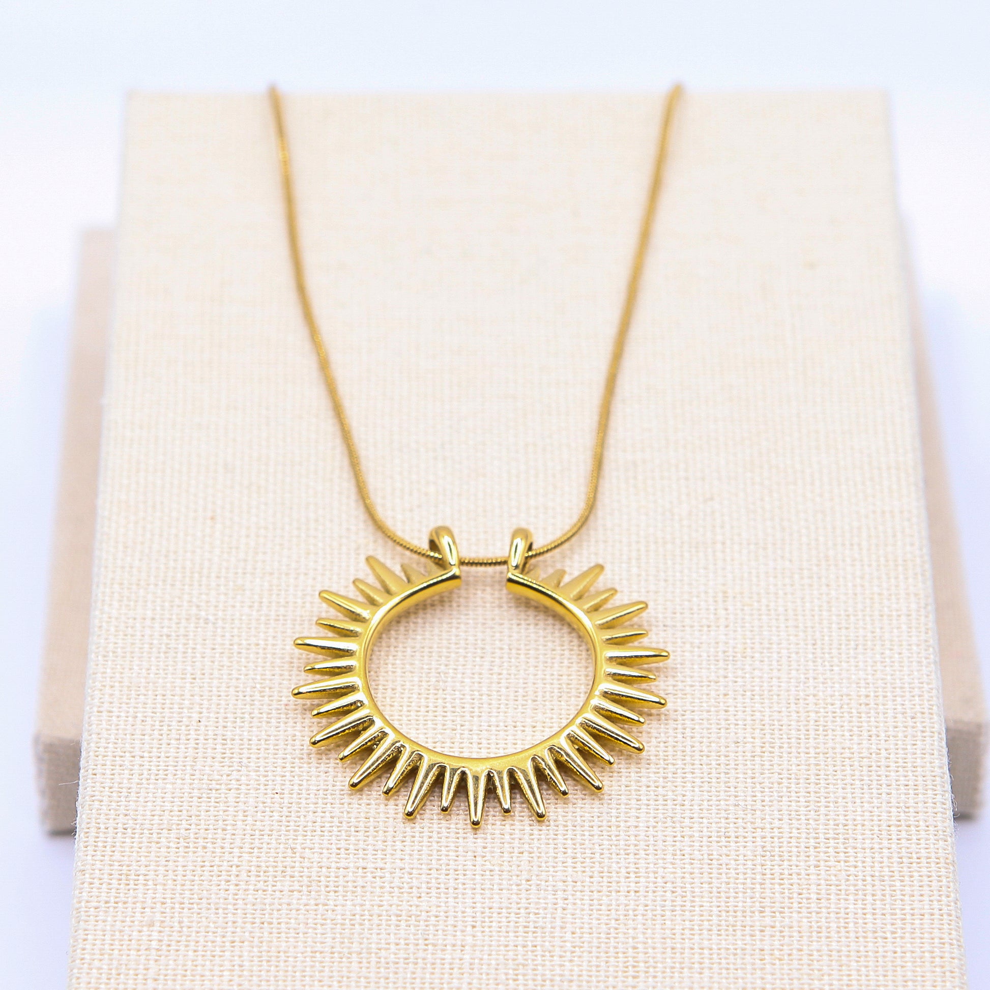 Beschreibung: ausdrucksstarke Kette mit einer feinen Schlangen-Gliederkette die durch einen großen Sonnen Anhänger (4,5 x 4,5 cm) geführt wird. Alle Materialen sind aus hochwertigen 316L Edelstahl mit 18K Gold plattiert. Die Sonne kann von beiden Seiten getragen werden (dreidimensional).