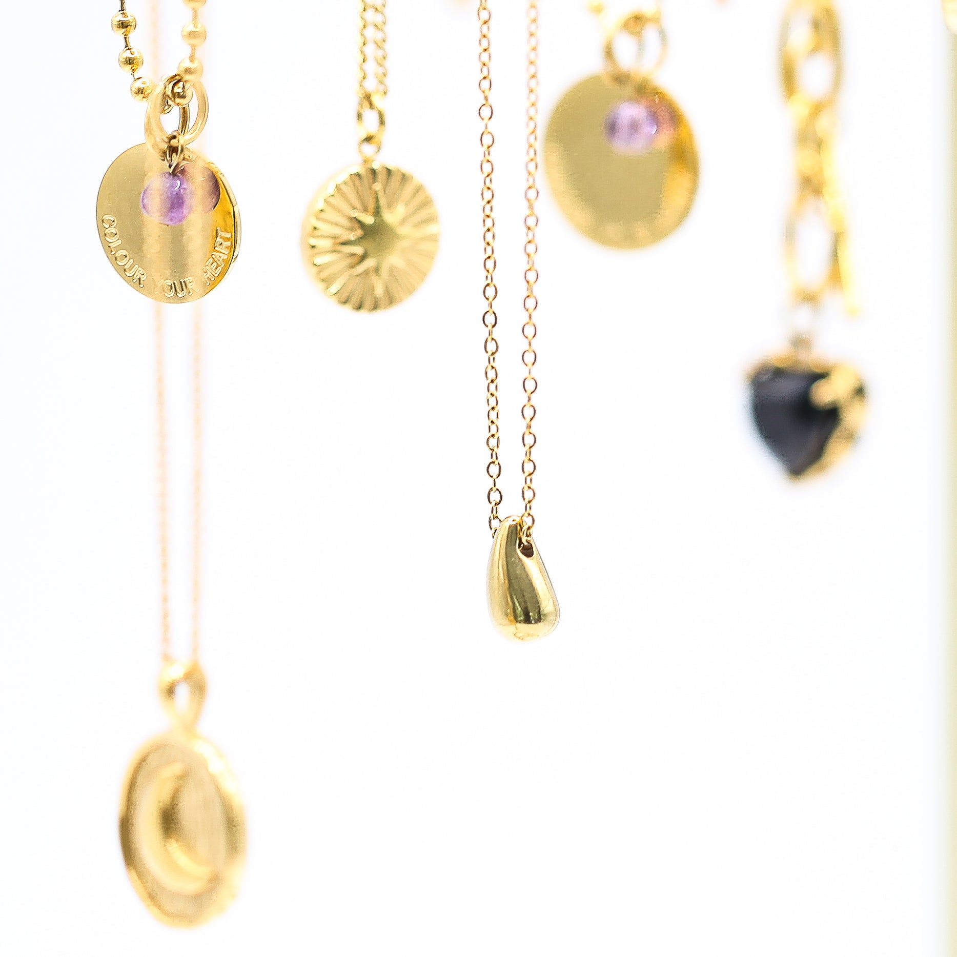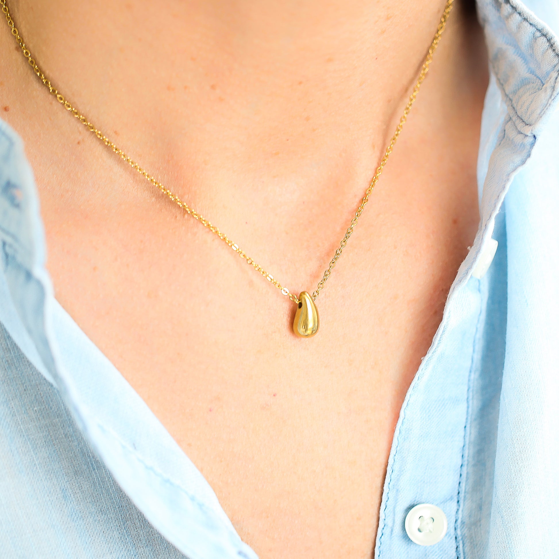 Beschreibung: Diese zarte Halskette trägt einen kleinen, massiven Tropfen, beides aus hochwertigen 316L Edelstahl mit 18K Gold plattiert. Nicht nur schön für den Alltag, sondern auch ein wunderbarer Begleiter für Sonne, Strand, Pool und Meer.