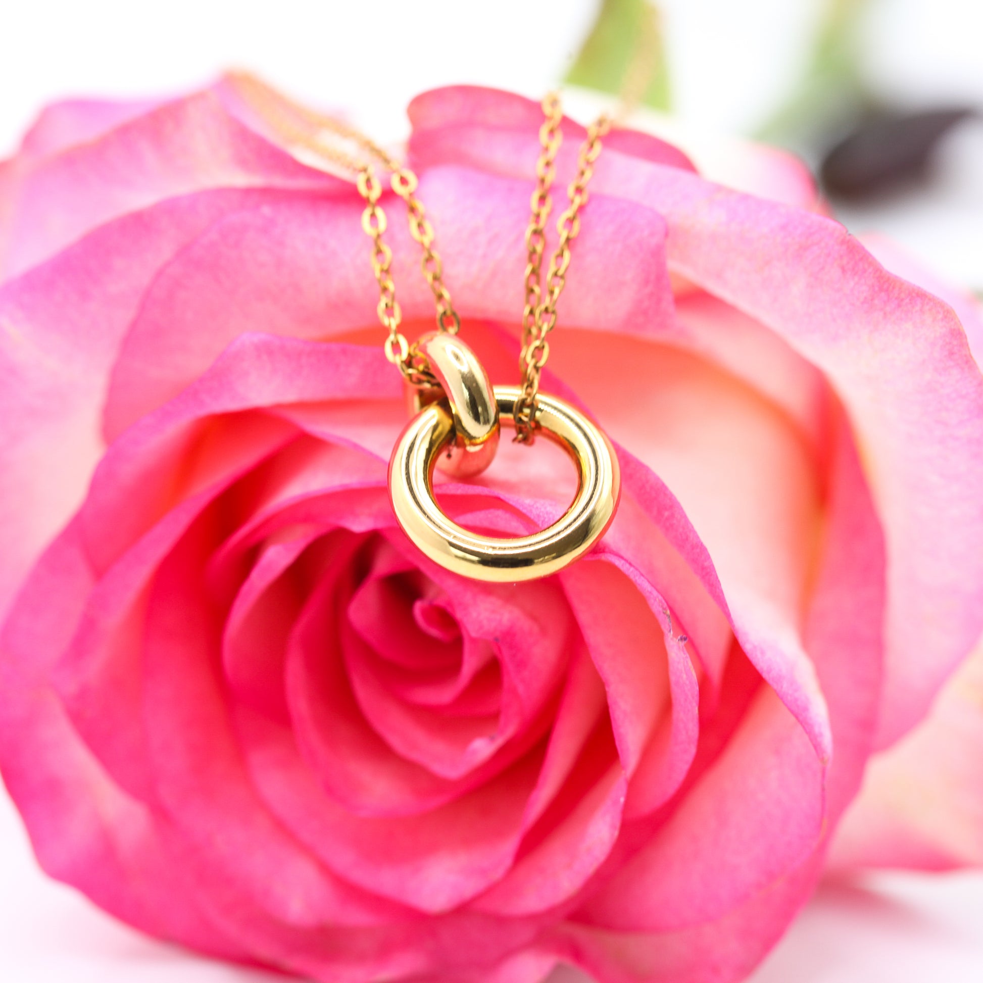 Beschreibung: Diese wunderschöne Halskette ist in der Front mit zwei größeren Goldringen fest verbunden. Mit einer doppelten, feinen Gliederkette wird diese Kette zu einem Verschluss im Nacken zusammengeführt. Kette und Öse sind aus hochwertigen 316L Edelstahl mit 18K Gold plattiert. Hypoallergen und dadurch sehr hautverträglich.