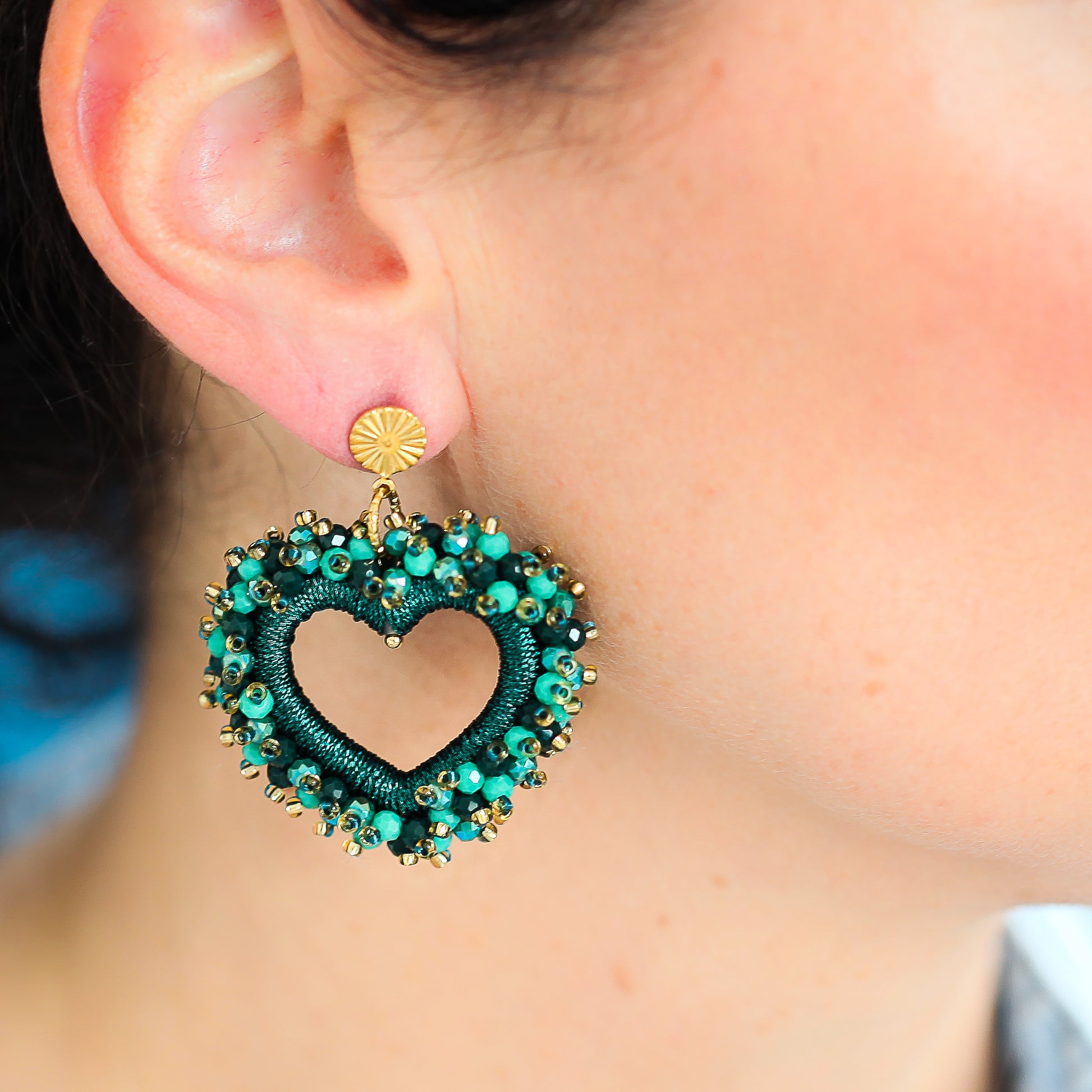 Beschreibung: Statement Ohrstecker in Herzform. Der Herzrahmen ist nach innen mit Textil umwickelt, außen herum ist das Herz mit vielen kleinen facettierten Funkelsteinchen geschmückt. Diese Ohrringe kann man wunderbar zur Jeans mit T-Shirt, aber auch sehr gut auf ein Sommerkleid, zu festlichen Anlässen oder zum Dirndl tragen. Die Ohrstecker sind aus hochwertigen 316L Edelstahl (18K Gold) gefertigt.