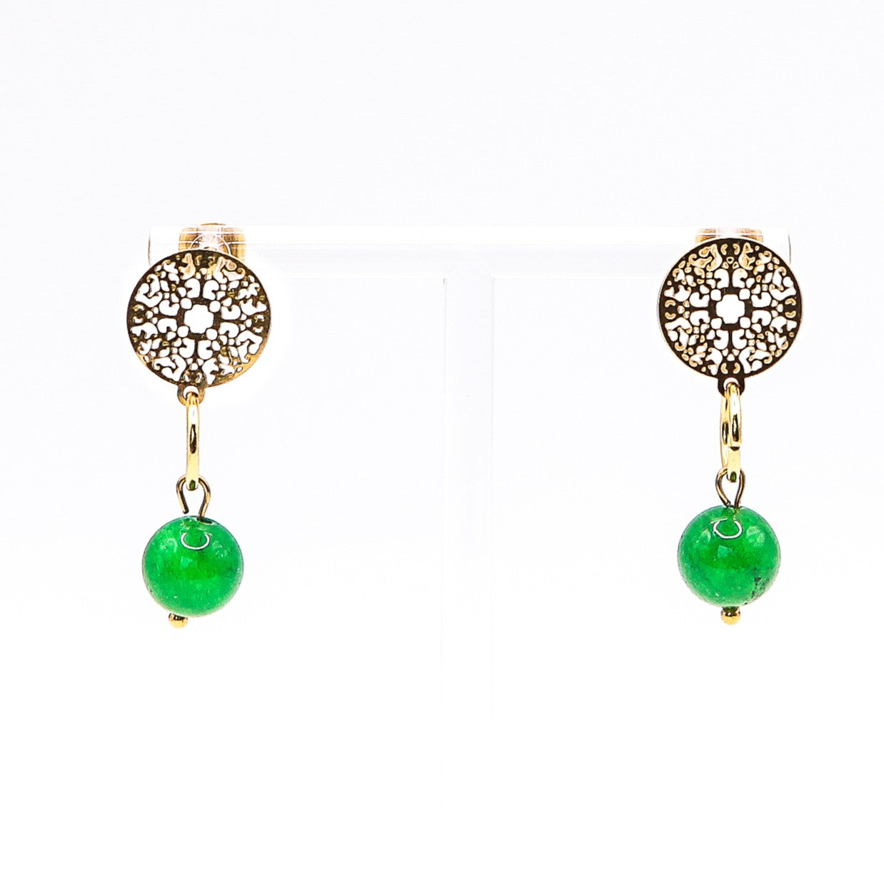 Beschreibung: Diese süßen Ohrringe mit Ornamentstecker und einer baumelnden Jadesteinkugel setzen Deine Ohren verspielt und elegant in Szene. Handgefertigt in Bayern.